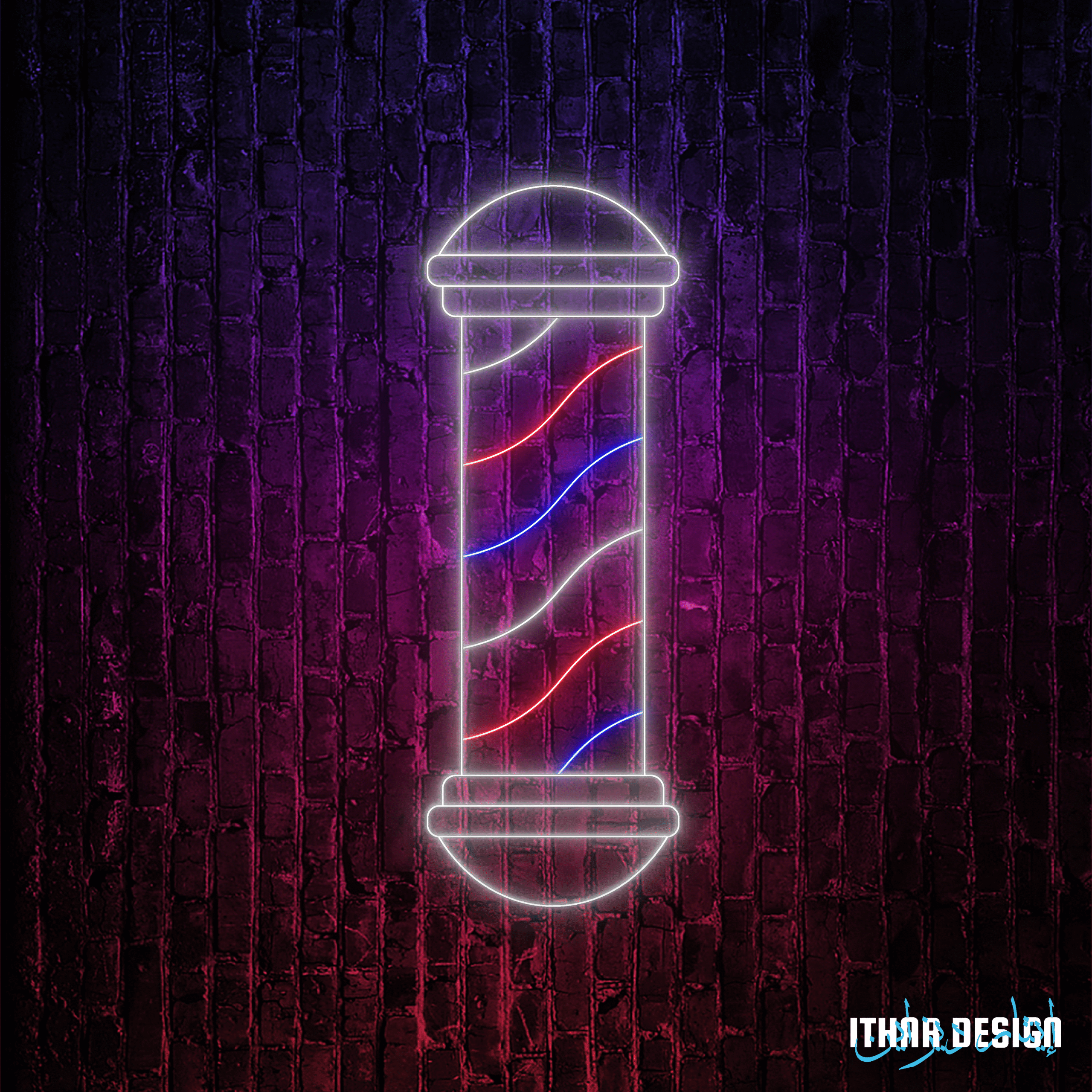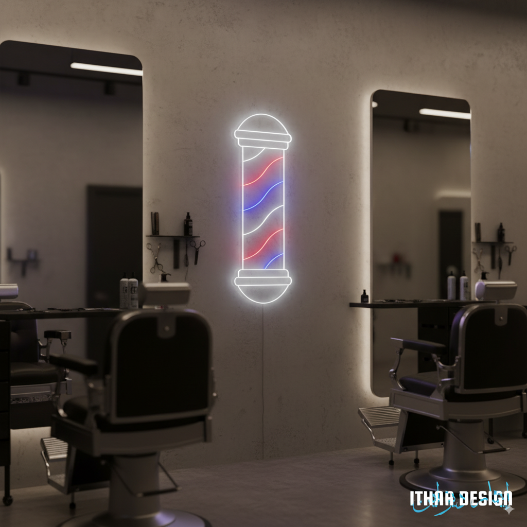 enseigne néon barbier, poteau barbier LED, déco salon coiffure Maroc, enseigne néon barber, lumière LED barbier, Ithar Design enseigne, signalétique salon coiffure, enseigne lumineuse Maroc