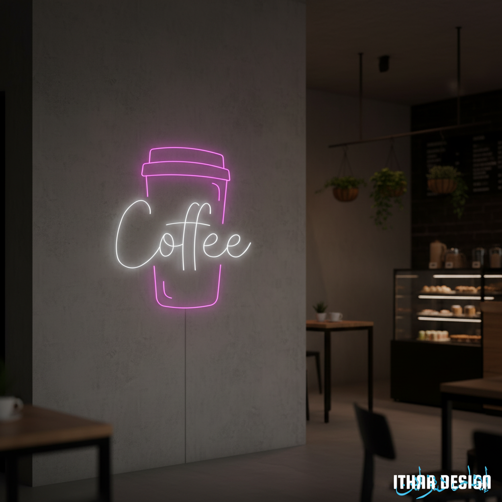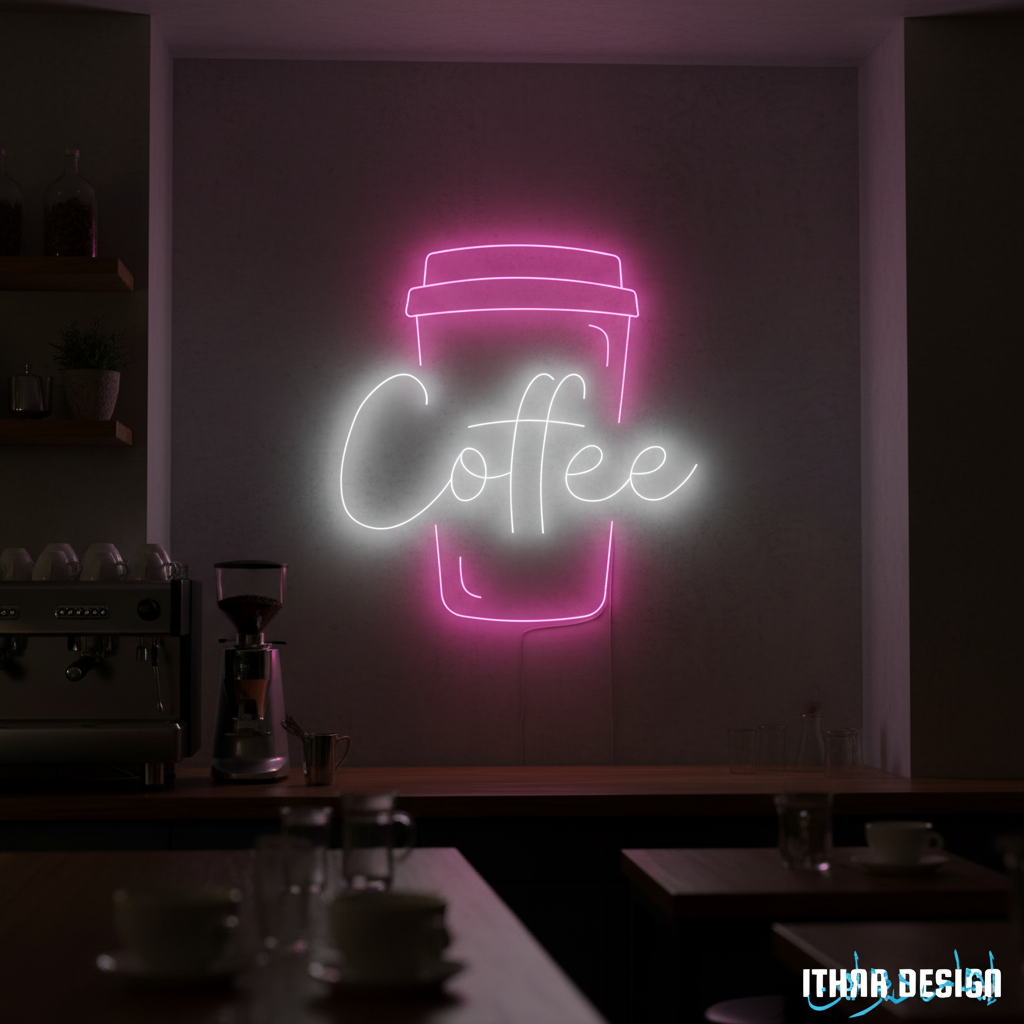 Illuminez votre café ou votre intérieur avec une enseigne néon tasse de café, une lumière LED élégante fabriquée à la main au Maroc par Ithar Design (Morocco).