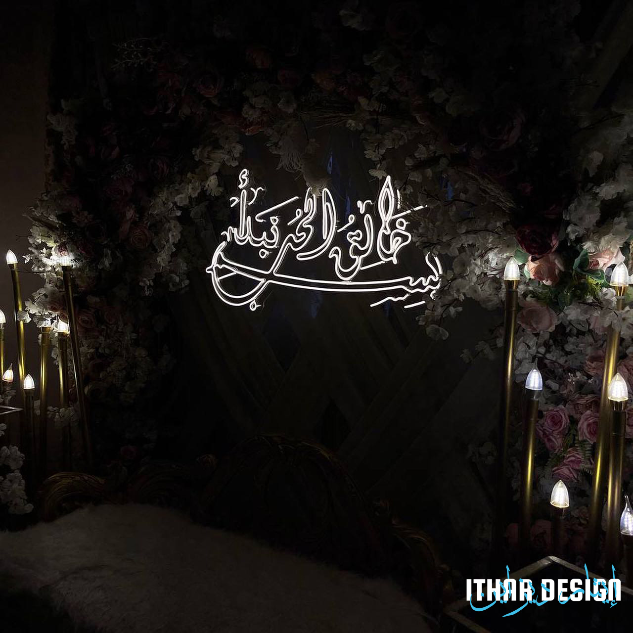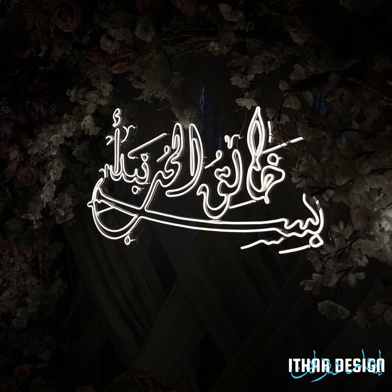 Illuminate your wedding with a heartfelt LED neon sign reading “In the Name of the Creator of Love.” Designed by Ithar Design (Morocco), it blends romance, faith, and modern elegance beautifully.